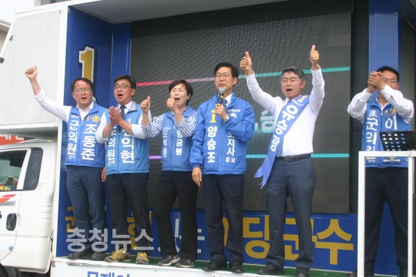 양 후보는 이날 유세에서 “양승조와 유승광을 선택하는 것은 문재인 대통령을 선택하는 것과 같다”며 “충남에 기업을 유치하고 혁신도시 지정을 받아내 경제를 살릴 것”을 약속했다.