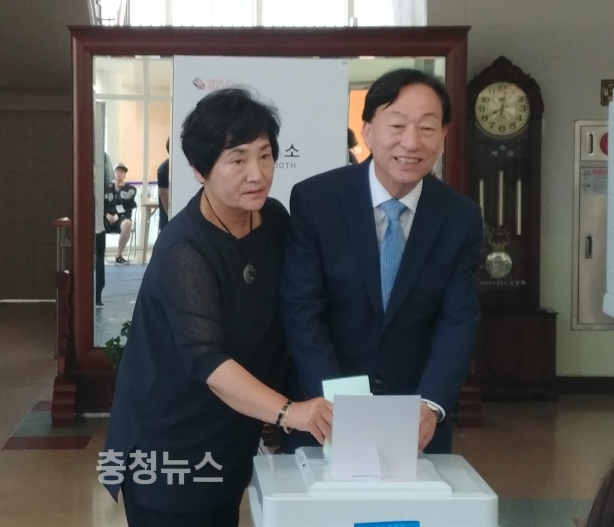 설동호 대전시교육감 후보가 13일 오전 8시 반석초등학교에서 부인과 투표하고 있다.