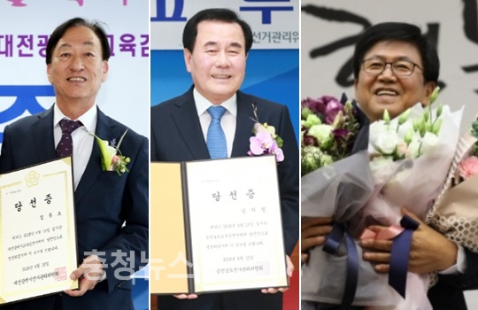 (왼쪽부터) 설동호, 김지철, 최교진 교육감 당선인이 15일 당선증을 수령했다.