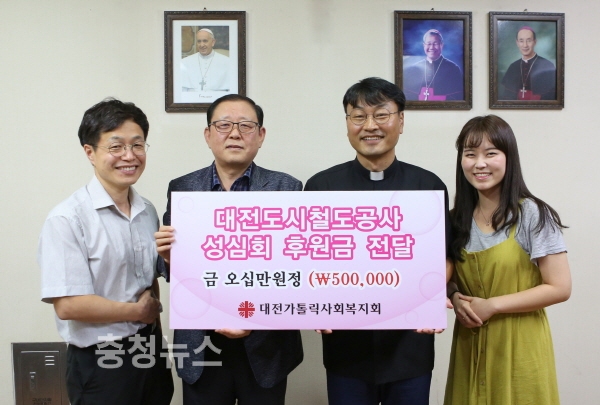 대전도시철도공사 봉사 동호회인 성심회(회장 김정옥)는 11일 대전카톡릭사회복지회(사목국장 나봉균신부)을 찾아 성금 50만원을 기탁했다.