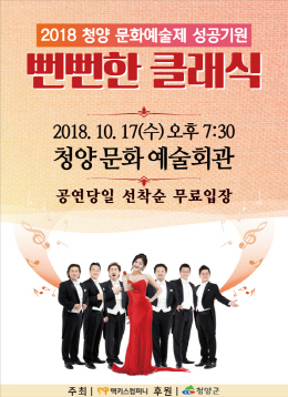 청양문예회관에서는 오는 17일 저녁 7시 30분 맥키스오페라단이 선보이는 클래식과 뮤지컬에 개그를 더한 힐링콘서트 ‘뻔뻔(fun fun)한 클래식’ 공연이 개최된다. 이번 공연은 오는 18일부터 20일까지 열리는 ‘2018 청양문화예술제’의 전야제로 성공개최의 염원을 담은 최고의 공연으로 청양군민을 찾아온다.