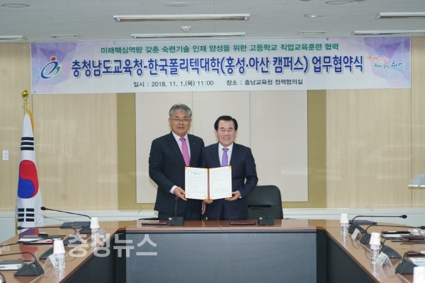 충남도교육청(김지철 교육감)은 한국폴리텍대학(홍성․아산 캠퍼스)과 1일 도교육청 정책협의실에서 미래핵심역량 갖춘 숙련기술 인재 양성을 위한 고등학교 직업훈련 업무협약을 맺었다.