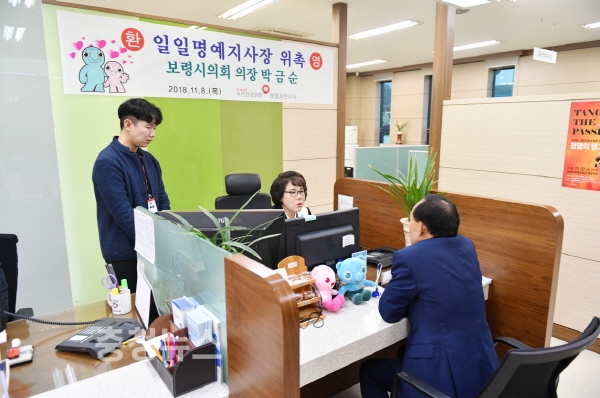 박 의장은 국민건강보험공단 보령지사에서 열린 일일 명예지사장 위촉식에 참석해 위촉장을 전달 받고 국민건강보험공단 보령지사장으로서 직무를 수행했다.
