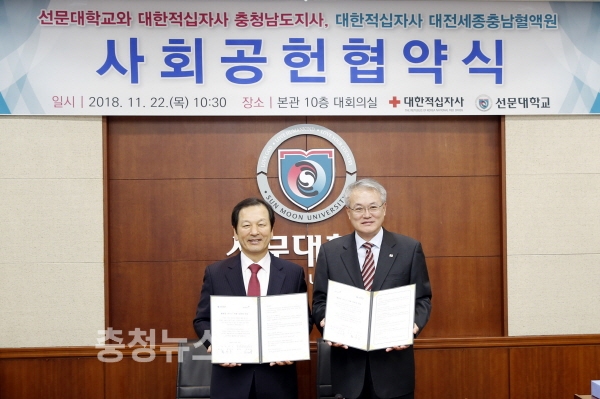 선문대학교(총장 황선조)가 22일 대한적십자사 충남지사(지사회장 유창기)와 사회봉사인증을 위한 사회공헌협약을 체결했다.