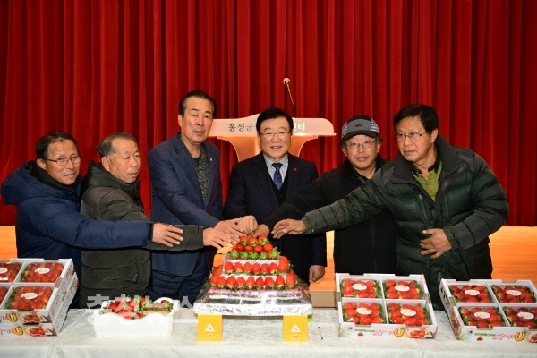 홍성군딸기연구회(회장 이수하)는 지난 8일 홍성군 농업기술센터 대강당에서 김석환 홍성군수를 비롯한 관내 딸기농가 150여 명이 참석한 가운데 홍성딸기 통합브랜드 공동 출하식을 열고 ‘홍성딸기U’ 라는 대표브랜드의 본격 가동을 알렸다.