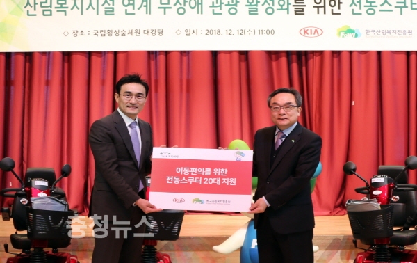 산림청 한국산림복지진흥원(원장 윤영균, 이하 진흥원)은 12일 강원 횡성군 둔내면 소재 국립횡성숲체원에서 윤영균 진흥원장, 노계환 기아자동차 CSR경영팀 부장, 한정재 (사)그린라이트 사무국장 등 30여 명이 참석한 가운데 전동 스쿠터 전달식을 가졌다고 밝혔다.