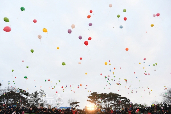 또한 가족, 친구와 함께 참여한 사람들은 예산군새마을회가 준비한 떡국을 나눠먹고 일출에 맞춰 1100개의 소망풍선을 날리며 기해년 새해의 힘찬 출발을 축하했다.