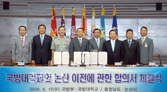 ▲ 국방부와 국방대학교는「국방대학교 논산이전」관련 2007년 12월 11일 국가균형발전위원회의 결정 및 2008년 12월 13일 국회 예산결정을 존중하여, 원칙적으로 국방대학교를 논산으로 이전하며,