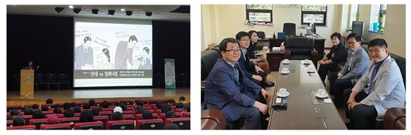 한편 설명회에 앞서 을지대학교 이승훈 의과대학장, 임숙빈 간호대학장, 대전고용복지플러스센터 윤옥균 소장 등 관계자들이 간담회<사진 오른쪽>를 갖고, 청년구직자 취업지원 활성화와 변화된 채용방식에 대한 지원 및 유기적 협력을 약속했다.
