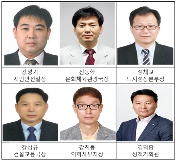 ▲ 시민안전실 안전정책과장 윤병준 ▲문화체육관광국 체육진흥과장 안종수 ▲보건복지국 복지정책과장 김회산 ▲도시성장본부 도시정책과장 이두희 ▲도시성장본부 스마트도시과장 장민주 ▲건설교통국 건축과장 김규범 ▲감사위원회 사무국장 이상훈