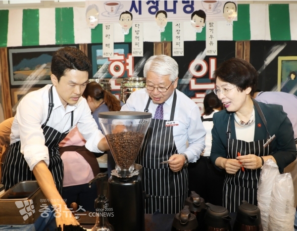 장애와 비장애의 벽을 허무는 행사답게 서금택 의장을 비롯한 시의원들과 장애인들은 한 팀을 이뤄 참석자들에게 종촌종합복지센터 장애인보호작업장 생산품과 커피 등을 판매했다.
