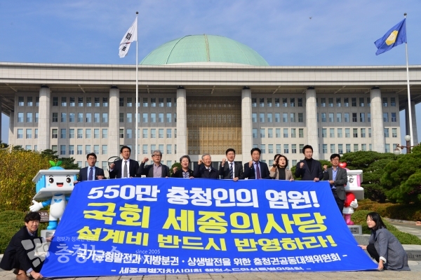 6일 국회의사당 분수대 앞에서 세종특별자치시의회 행정수도완성특별위원회(위원장 윤형권),국가균형발전과 지방분권·상생발전을 위한 충청권공동대책위원회(공동대표 김준식)는 국회 세종의사당 예산반영 촉구 퍼포먼스를 펼치고 있다.