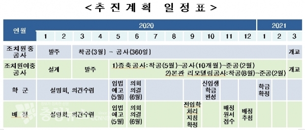 조치원중은 총 203억 원의 사업비를 들여 연면적 12,316㎡ 지하 1층 지상 4층 건물에 학년별 일반 10학급과 특수 1학급 포함 총 31학급 750명 규모로 신축하며,