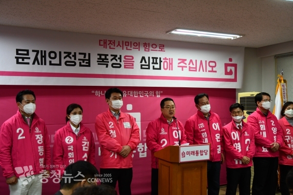 20일 이장우(동구)·정용기(대덕구)·이은권(중구) 등 3명의 현역 의원을 비롯해 이영규(서구갑)·양홍규(서구을)·장동혁(유성갑)·김소연(유성을) 등 지역구 탈환을 노리는 후보들은 합동 기자회견을 열고 “이번 선거는 문재인 정권을 국민의 힘으로 심판하는 선거”라고 밝혔다.