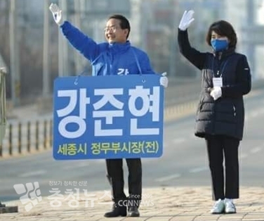 강준현 더불어민주당 세종을 후보는 25일 신흥네거리에서 아침 인사를 하며 지지를 호소했다.