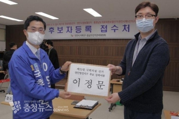 이정문 더불어민주당 천안(병) 국회의원 후보는 26일 천안 지역 첫 번째로 동남구선거관리위원회에 후보자등록을 마쳤다.