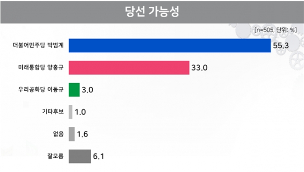 ‘잘 모르겠다’는 유보적 답변이 6.1% 나왔고, 우리공화당 이동규 후보가 이길 것이라는 의견이 3.0% 나왔다.