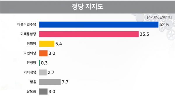 정당지지도는 민주당이 통합당에 7%p 앞서고 있는 것으로 나타났다. 정당지지율은 더불어민주당 42.5%, 미래통합당 35.5%, 정의당 5.4%, 국민의당 3.0%, 민생당 0.3% 순서였다.