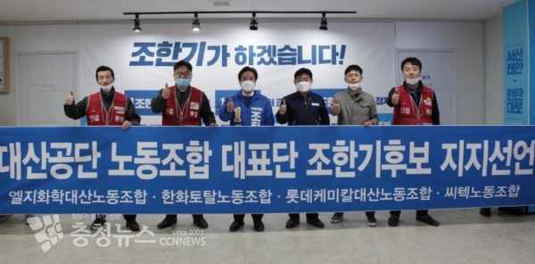 9일 오후 4시 대산공단 한화토탈노동조합 맹진석위원장, 롯데케미칼대산노동조합 최재동지회장, 엘지화학대산노동조합 송호섭위원장, 김재철부위원장, 정영달후생복지부장 등 노조 대표단이 조한기 후보의 선거사무소를 찾아 조한기 후보에 대한 지지를 선언했다.