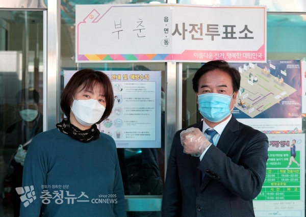 조한기 서산·태안 국회의원 더불어민주당 후보는 사전 투표 첫날 10일 아침 거리 인사를 마친 오전 서산시 부춘동 소재 부춘중학교를 찾아 배우자와 함께 사전투표를 마쳤다.