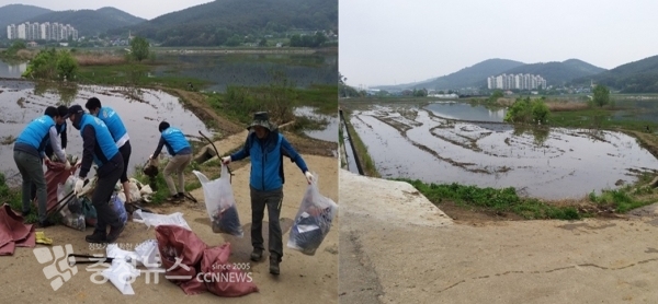 풍전저수지 환경정화실시 전후 / 충청뉴스 최형순 기자