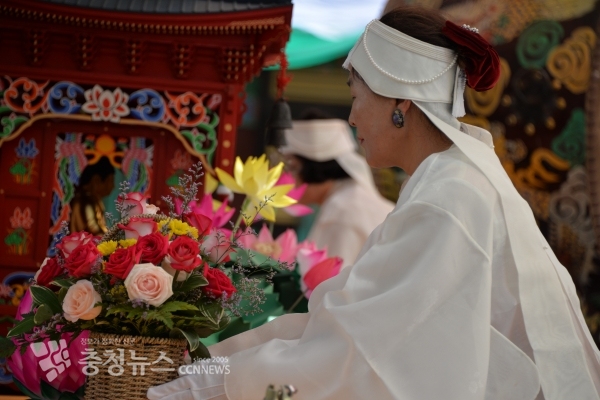 이날 행서는 삼귀의를 시작으로 ‘한글 반야심경’, 보현행원(普賢行願), 둥근소리 합창단의 부처님 오신날과 꽃피고 새가 날고 음성공양과 부처님께 향과 차, 꽃, 등, 꽃, 과일, 곡식을 올리는 육법공양(六法供養), 발원문 봉독, 청법가,법문, 염불화장학금 수여식, 욕불의식 순으로 이어졌다.