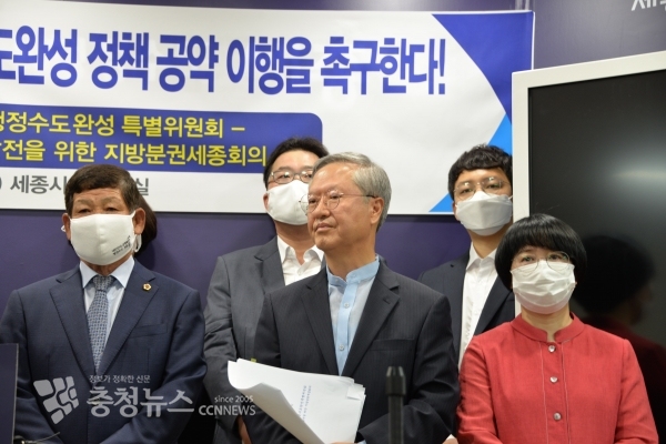 세종특별자치시의회 행정수도완성특별위원회(위원장 채평석, 이하 행정수도특위)와 ‘행정수도완성과 국가균형발전을 위한 지방분권세종회의(상임대표 김준식․정준이, 이하 지방분권세종회의)’는 1일 세종시청 정음실에서 ‘행정수도완성 정책’공약 이행을 촉구하는 성명서를 발표했다.