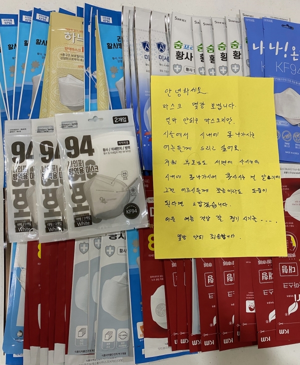 기부자는 편지를 통해 “저희 부모님도 연서면에 사시는데 시내에 못 나가셔서 마스크를 사시기가 힘들다”며 “그런 어르신들에게 조금이라도 도움을 드리고 싶다”고 했다.