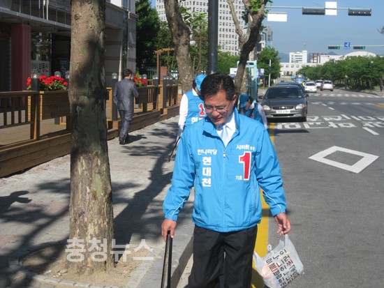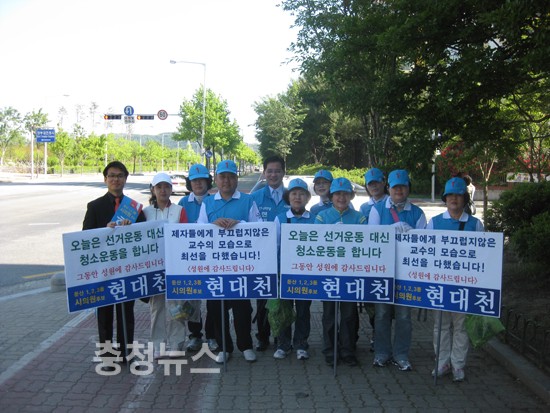 대전 서구 둔산 1.2.3.동에 출마한 시의원후보 현대천과 선거 운동원들은 지방선거를 하루앞둔 1일 청소 선거운동을 벌여 시민들로부터 좋은반응을 얻었다고 한다.
