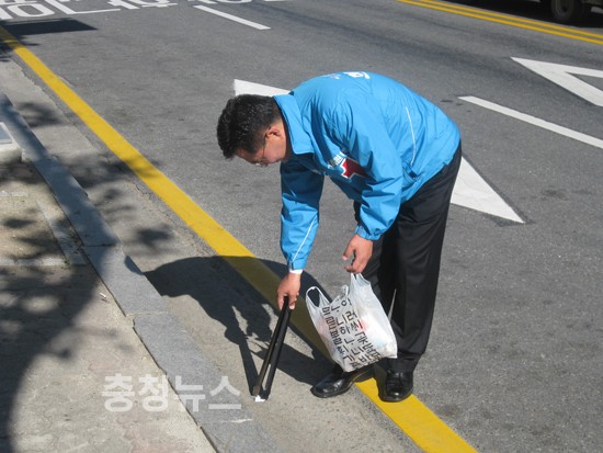 ▲ 쓰레기를 줍는 현대천 후보