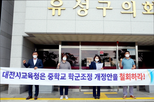 유성구의회 이금선 의장을 비롯한 송재만, 김연풍, 하경옥 의원은 18일 대전시교육청의 중학교 학군 배정 개정안에 대한 철회를 요구하는 성명서를 발표했다.