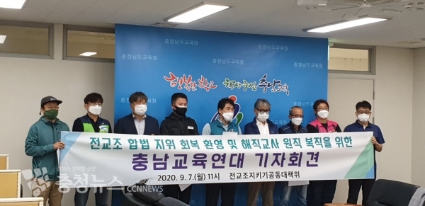 충남교육연대는 7일 충남교육청 기자실에서 기자회견을 열고 "해직교사들의 빠른 복직을 위해 적극 나서달라"고 촉구했다.