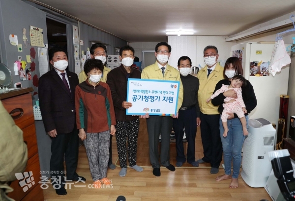 충남도는 13일 양승조 지사, 도의회 의장, 당진시장 등이 참석한 가운데 당진시 석문면 화력발전소 주변 지역 영아 가정에 공기청정기를 전달했다고 밝혔다.