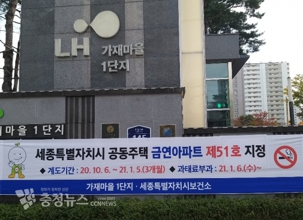 세종시 도움1로 가재마을 1단지 아파트(소장 박상희)가 공동주택 내 담배연기 없는 건강한 주거환경 조성을 위해 세종시보건소로 부터 '공동주택 금연 아파트 제51호‘로 지정 됐다.