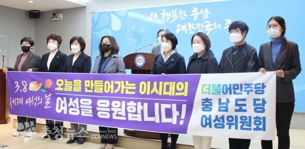 더불어민주당 충남도당 여성위원회(위원장 김연)가 8일 세계여성의 날을 맞아 "2022년 지방선거에서 여성 후보 40% 이상을 공천해야 한다"고 강조했다.