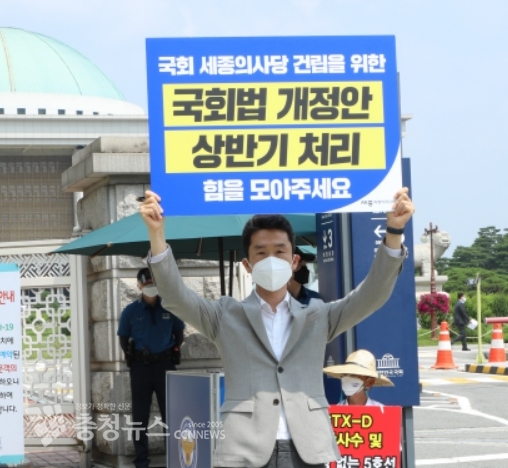 세종시의회 행정수도완성특별위원회가 24일 여의도 국회의사당 앞에서 국회법 개정을 촉구하기 위한 1인 릴레이 시위를 벌였다.
