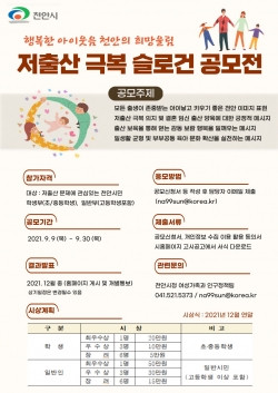 공모 주제는 △모든 출생이 존중받는 아이낳고 키우기 좋은 천안의 이미지 표현 △결혼은 행복, 출산은 감동, 자녀는 희망, 육아는 부모와 아이가 함께 성장하는 것이라는 감성을 일깨워주는 메시지 △출산 보육을 통해 얻는 감동과 보람 행복을 일깨우는 메시지 △일·가정 균형 및 부부 공동 육아 문화 확산을 실천하는 메시지이다.
