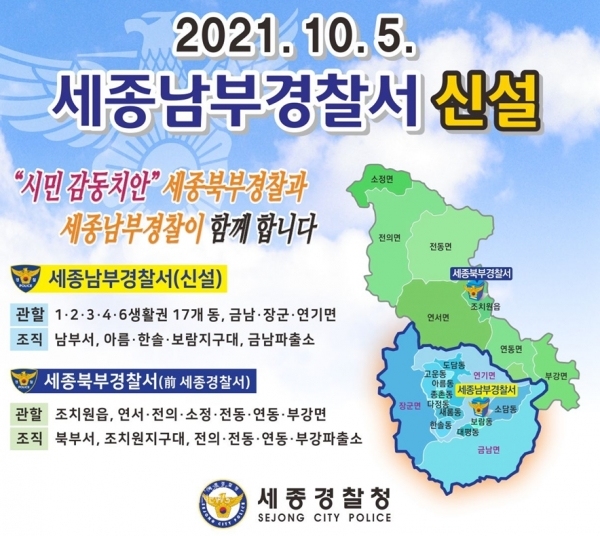 ※ 기존의 세종경찰서는 세종북부경찰서로 명칭이 변경되고 조치원읍, 연서·전의·소정·전동·연동·부강면을 관할