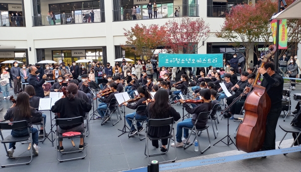 [충청뉴스 이성현 기자] 대전지역 학생 40여 명으로 구성된 조이청소년오케스트라가 7일 오후 3시 유성구 용산동 현대프리미엄아울렛 대전점 중앙분수대 앞에서 버스킹 연주회를 열고 시민들에게 무르익어가는 가을의 정취를 가득 담은 아름다운 선율을 선물했다.
