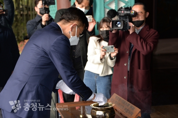 이날 현충사 참배 방명록에는 "사즉생(死卽生)각오로 소중한 일상 안전하게 지켜내겠습니다. 대한민국 최고의 안전한 도시를 만들겠습니다"라고 적었다.