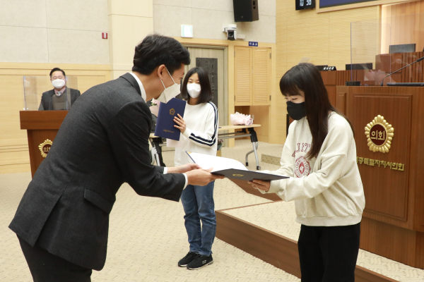 [충청뉴스 최형순 기자] 세종특별자치시의회(의장 이태환)는 22일 본회의장에서 ‘2021년 청소년 의회교실 소감문 공모전’ 시상식을 개최하고 우수작으로 뽑힌 6명에게 상장을 수여했다.