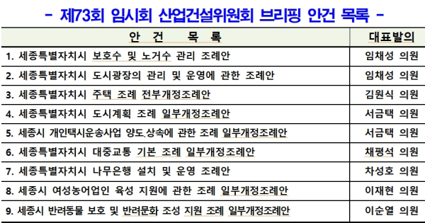 산건위에 상정된 주요안건 중 의원발의 조례 제정 및 개정안은 총 9건이다.