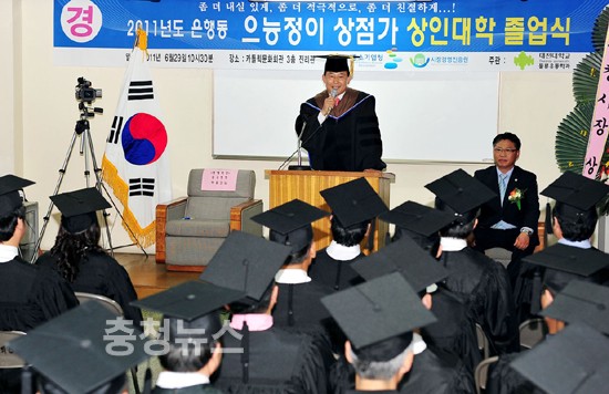 대전 중구(구청장 박용갑)는 29일 경영혁신과 상인의식 변화를 통한 중심상권 활성화를 모색하기 위해 개강했던 ‘은행동 으능정이 상점가 상인대학’을 마치고 졸업생 등 70여 명이 참석한 가운데 가톨릭문화회관에서 졸업식을 가졌다.