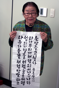 그나마 그전에는 날마다 두 시간씩 서예연습을 했으나 무릎수술을 받은 뒤로는 “수업 전날 3~4시간 쓰는 게 전부.”라며 “햇수는 갈수록 느는데 실력은 자꾸 주는 것 같다.”라고 속상해하는 눈치다.
