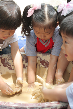 이천도자기 흙을 원료로 한 흙물감 그림 그리기, 흙 판에서 뛰어놀기, 흙물 가지고 놀기 등 다양한 체험활동이 탁 트인 학습원 마당, 뒷산 체험장 등지에 펼쳐졌다.