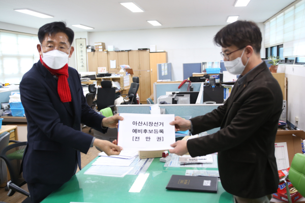 [충청뉴스 최형순 기자] 10일 오전 전만권 아산도시행정연구원장(전 천안시 부시장)이 아산시선관위에 예비후보 등록을 마치며 아산시장 선거의 첫 신호탄을 울렸다.
