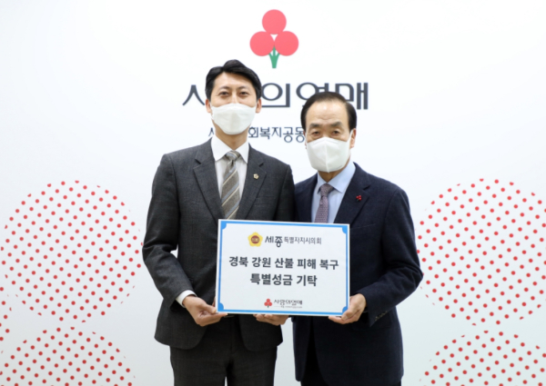 [충청뉴스 최형순 기자] 세종특별자치시의회(의장 이태환)는 16일 대형 산불로 큰 피해를 입은 강원도와 경북 지역 주민들의 조속한 일상 회복을 기원하며 세종사회복지공동모금회(회장 홍영섭)에 성금을 기탁했다.