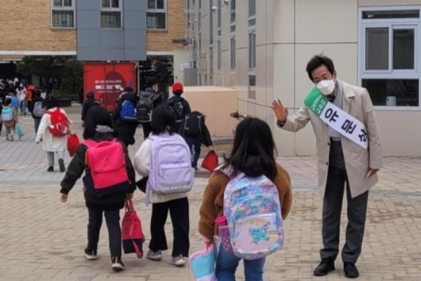 [충청뉴스 최형순 기자] 유문상 세종시교육감 예비후보가 16일 아름초등학교를 방문하여 학생들과 등교인사를 나누고 학생들 교통안전지도를 했다.