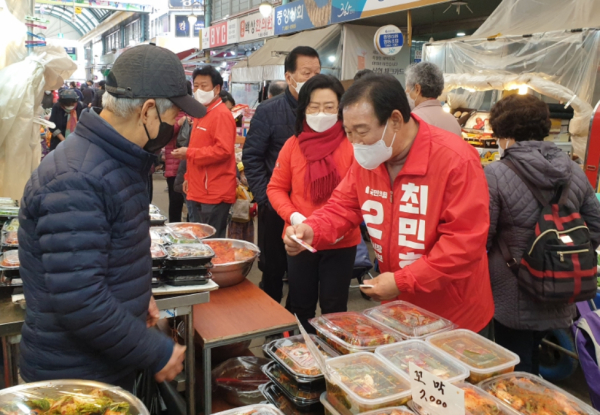 전통시장을 찾은 최민호 세종시장 예비후보는 상인들의 애로 사항을 듣고 지지를 호소했다.