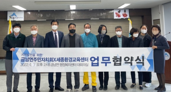 [충청뉴스 최형순 기자] 세종특별자치시 금남면 주민자치회(회장 박종권)가 7일 금남면사무소에서 세종환경교육센터(대표 손경희·센터장 이채연)와 업무협약을 맺고 환경보호 및 지역사회·교육 발전에 힘을 모으기로 했다.